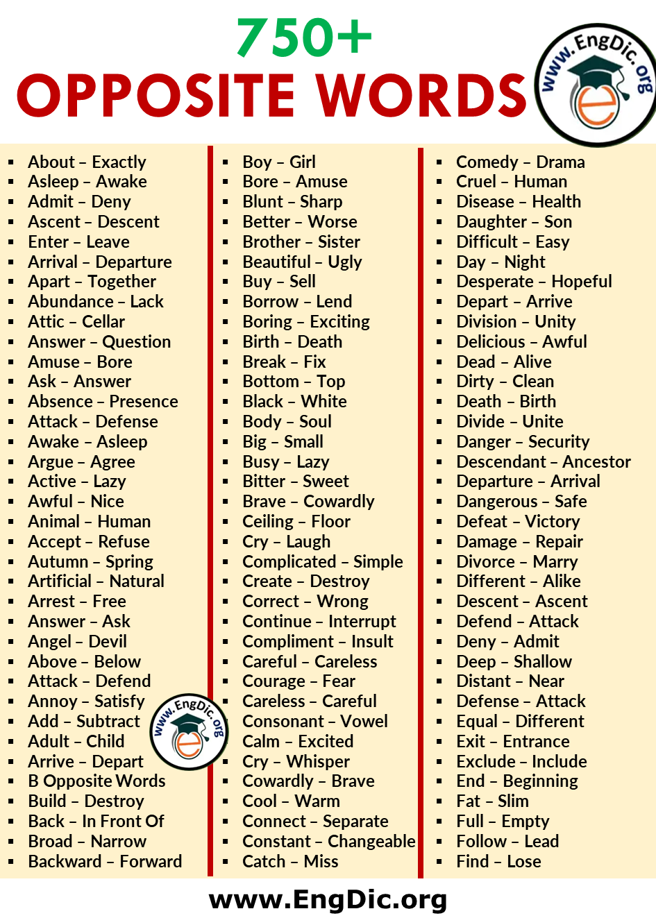 https://engdic.org/opposite-words-list-in-english+750 Opposite Words List in English PDF! Opposite words are words with opposite meanings. In this lesson, we are going to discuss the opposite words. Learning opposite words will help you add more words to your vocabulary. Below is the list of A to Z opposites: Opposite Words List in English A Opposite Words. about – exactly; asleep – awake ...